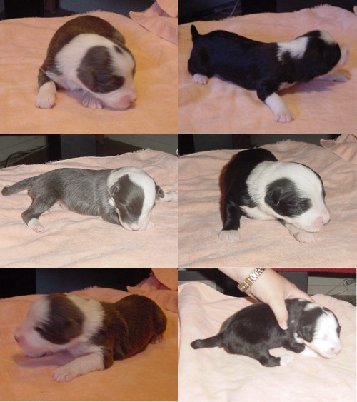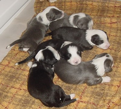 Nike was bred to Skyler in early June. The six puppies were born on August 5, 2004. There are three blue boys and two black boys, along with one black girl.